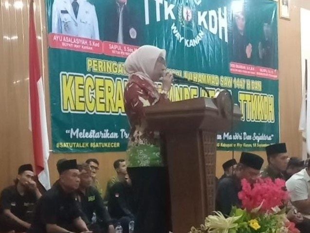 Bupati Way Kanan Ayu Asalasiyah dalam sambutannya menyampaikan rasa syukur dan kebahagiaan dapat hadir bersama masyarakat dalam momentum peringatan kelahiran Nabi Besar Muhammad SAW sekaligus menjaga tradisi adat kebudayan .