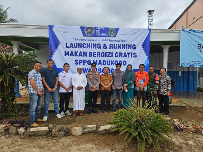Teks foto: Launching Program MBG dihadiri Kepolsek kotabumi Utara Hermanto, Camat Kota Bumi Utara yang di wakili oleh Kb.Aswan PB, Nusirwan dan pihak KA, Puskesmas Janges Bramantyo, Kepala Desa Madukoro Sultan Hamdi, Babinsa Danramil.