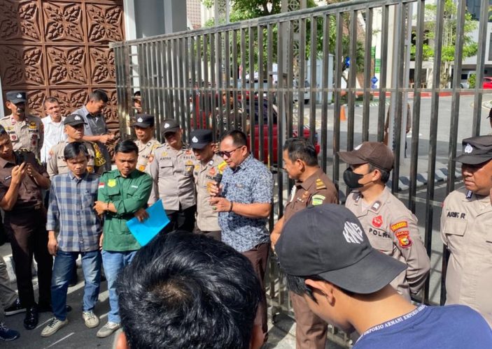 📸 Perwakilan Kejaksaan Tinggi (Kejati) Riau menanggapi massa aksi dari Gerakan Mahasiswa dan Kepemudaan Peduli Riau (GMPR) yang menggelar aksi damai di depan Gedung Kejati Riau, Senin (10/11/2025)/G45/Indra