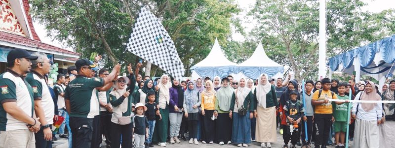Bupati Kampar, Ahmad Yuzar, dan Wakil Bupati Kampar, Misharti, melepas peserta jalan santai Gebyar HKN ke-61 di Lapangan Pelajar Bangkinang Kota. (G45/KZ).