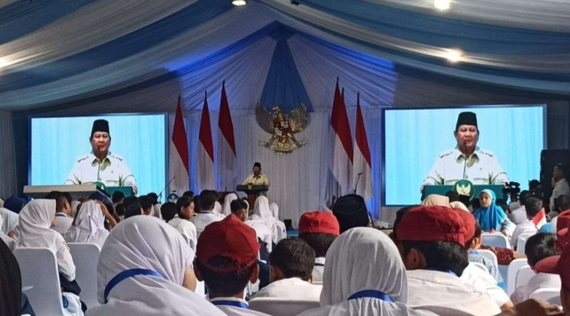 Presiden Prabowo memberi sambutan di SMPN 4 Bekasi saat meluncurkan Digitalisasi Pembelajaran pada Senin (17/11/2025). (G45/Net).