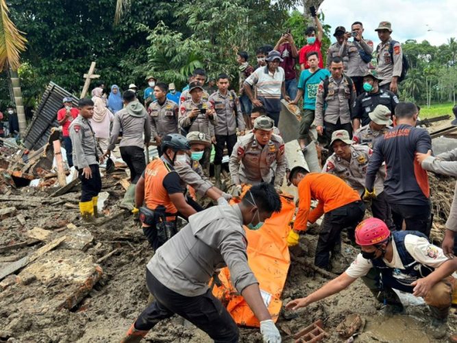 Personel Brimob mengangkat tandu berisi jenazah Samsimar dari lokasi banjir bandang menuju pos evakuasi. (G45/Humas)