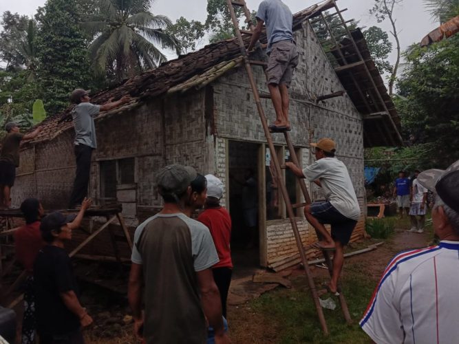 Aparatur bersama masyarakat bergotong royong membongkar rumah warga yang kondisi nya sangat memperihatinkan hari Minggu (18/1/2026) (G45/Ansori)