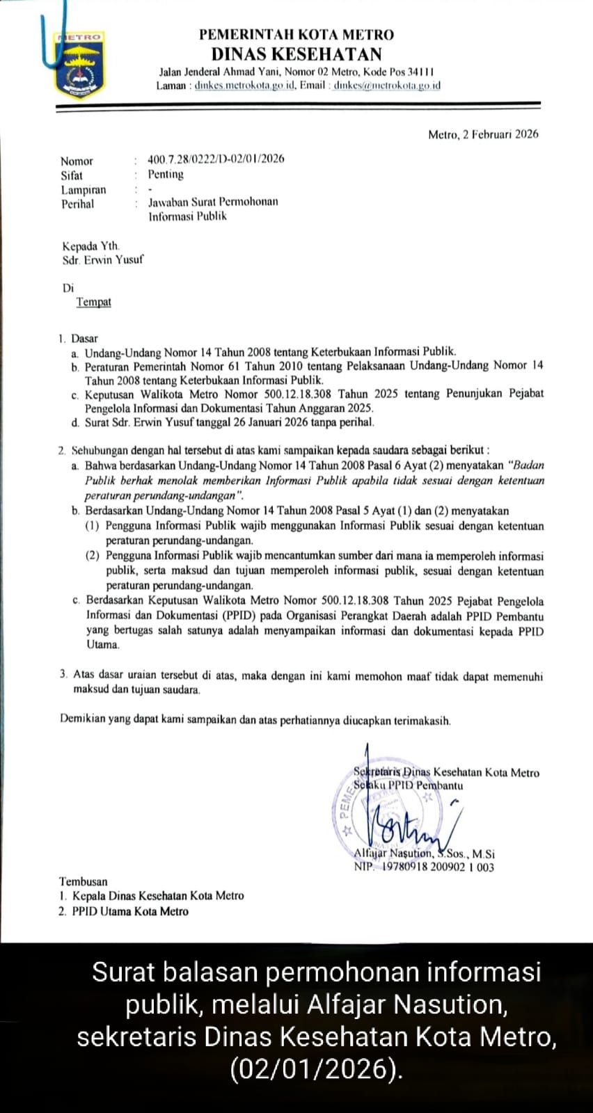 Permohonan informasi tersebut kemudian dijawab melalui surat balasan tertanggal 2 Februari 2026 yang ditandatangani oleh Sekretaris Dinas Kesehatan Kota Metro, Alfajar Nasution.