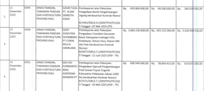 Namun, berdasarkan informasi yang beredar, sebagian pelaksanaan pengadaan tersebut tidak dilaporkan secara rinci kepada Pelaksana Tugas Kepala Dinas Tanaman Pangan dan Hortikultura Provinsi Riau. Kondisi ini diduga menjadi salah satu penyebab terjadinya tunda bayar yang kini membebani keuangan daerah.