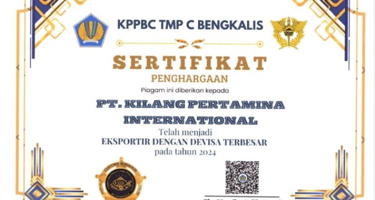 Eksportir dengan Devisa Terbesar di Kabupaten Bengkalis, PT KPIl RU II Sungai Pakning Raih Penghargaan Bengkalis|Oktober 6, 2025oleh Redaksi 1